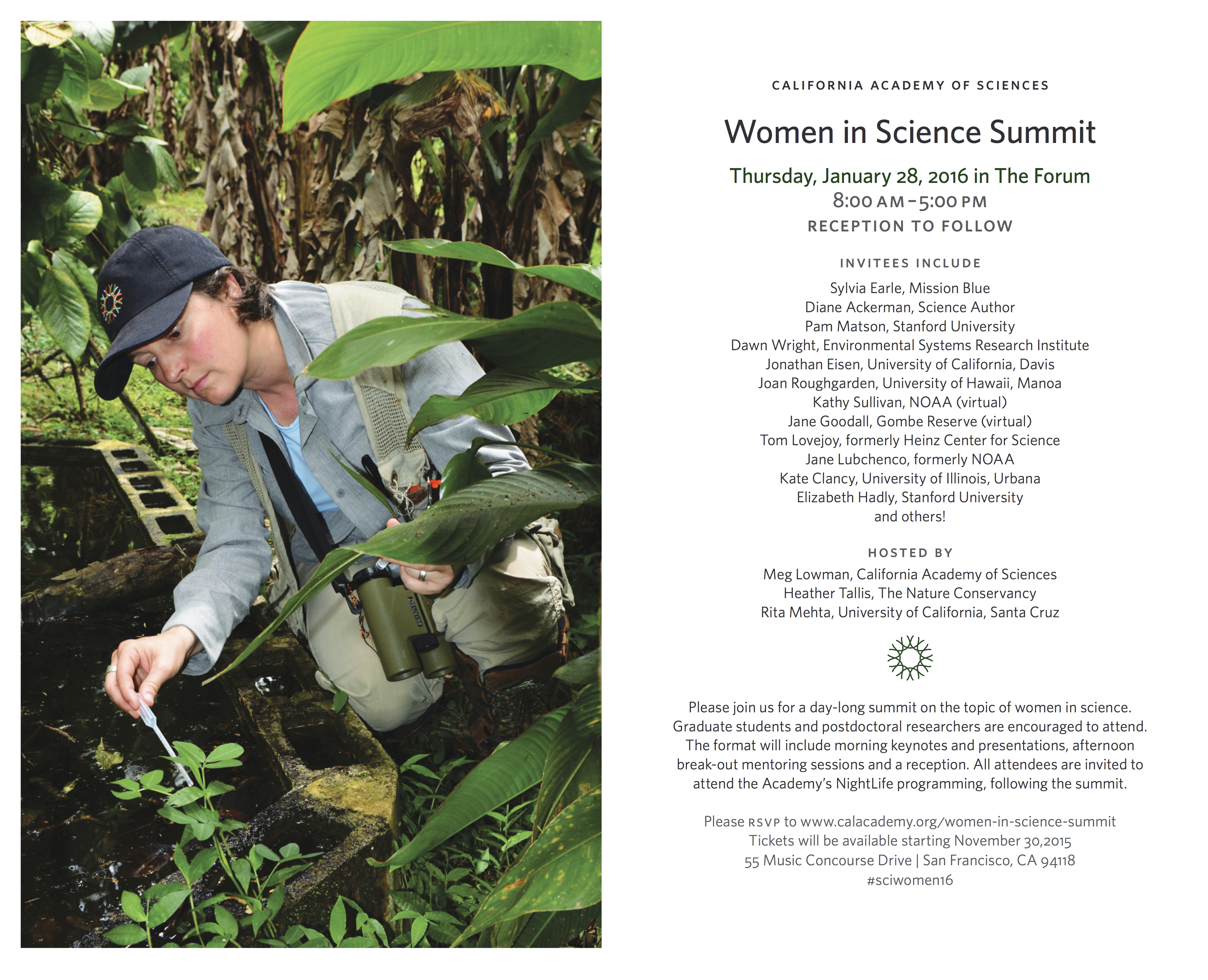 Jose Fragoso was honored to serve as a panelist at the amazing Women in Science Summit at the California Academy of sciences on January 28, 2016. Amazing people described how they maintained family life, dealt with bias challenges and succeeded in their careers. Speakers included: Jane Goodall (Gombe Reserve), Sylvia Earle (National Geographic Society Explorer-in-Residence), Dawn Wright (ESRI), Pam Matson (Stanford University), Jane Lubchenco (former head of NOAA), Kathy Sullivan (the first woman to walk in space) Tom Lovejoy, Joan Roughgarden and others. Google Hangouts live streamed the event.