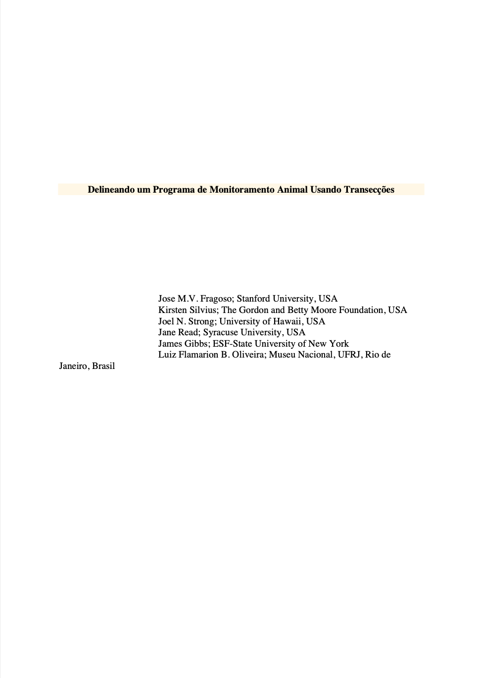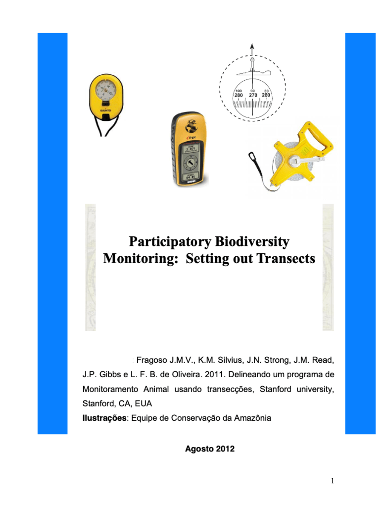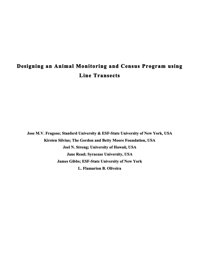 Designing an Animal Monitoring and Census Program using Line Transects. 2011. Fragoso J.M.V., Silvius K.M., Strong J.N., Read J.M., Gibbs J.P. & Oliveira L.F.B. Stanford University, Stanford, CA, USA.